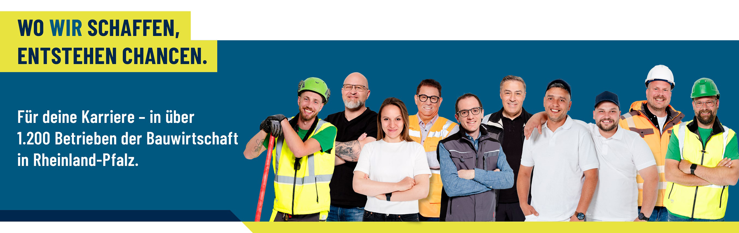 Die Bauwirtschaft Rheinland-Pfalz e.V. ist die gemeinsame Interessenvertretung für rund 1.200 Unternehmen des Baugewerbes und der Bauindustrie – aus acht verschiedenen Fachbereichen. Vom Familienbetrieb bis zum Großunternehmen – die Branche ist so vielfältig wie die Menschen, die sie gestalten. Ob Ausbildung, Aufstieg oder Quereinstieg – hier findest du Perspektiven mit Zukunft.
