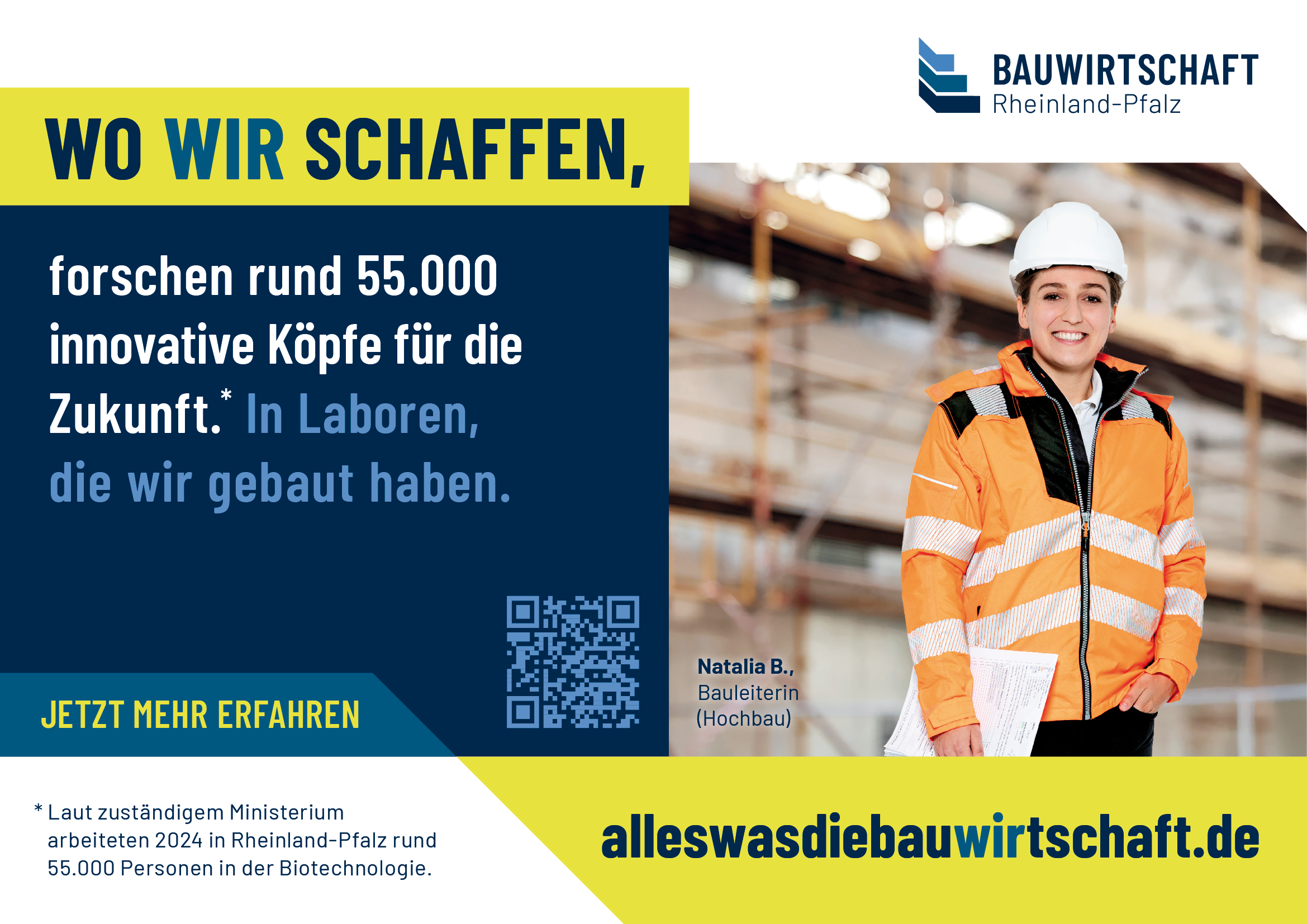 Die zur Verfügung gestellten Kampagnenmotive dürfen im Rahmen der redaktionellen Berichterstattung über die Bauwirtschaft Rheinland-Pfalz e. V. honorarfrei verwendet werden. Eine Bearbeitung ist nur im Rahmen der üblichen redaktionellen Nutzung zulässig. Bei Veröffentlichung ist der Bildnachweis anzugeben.