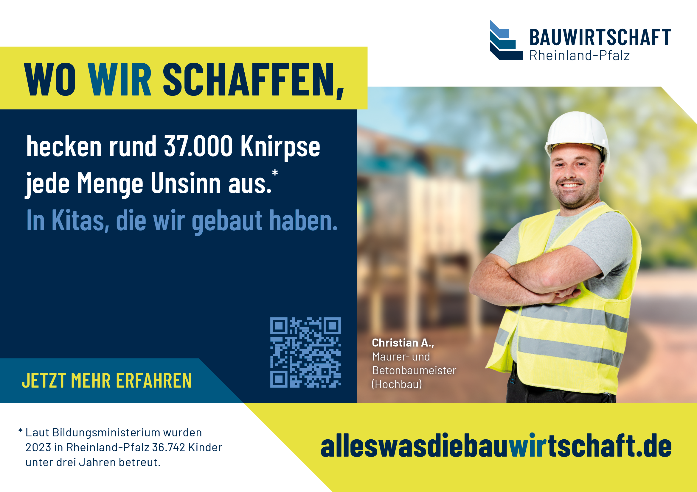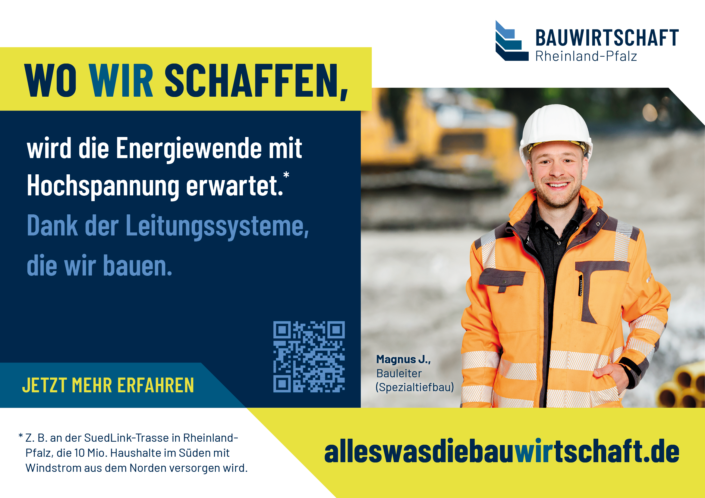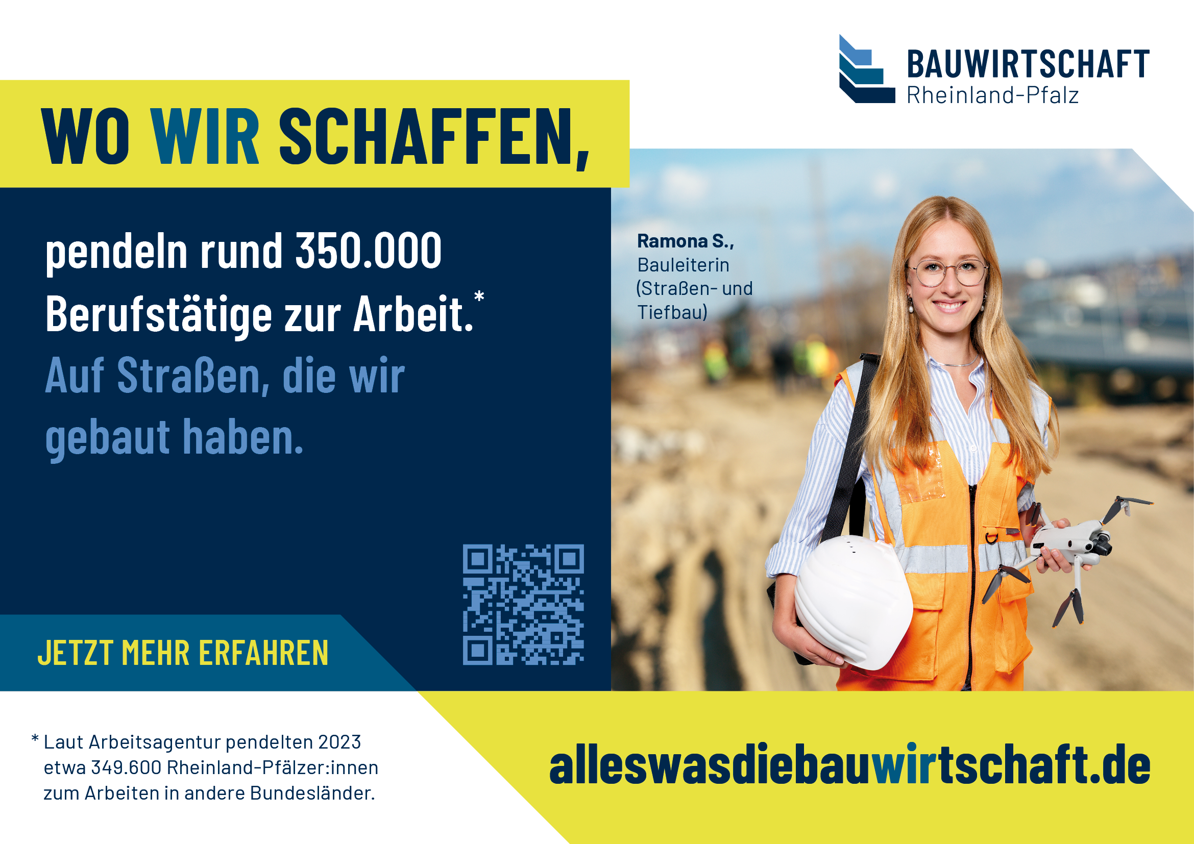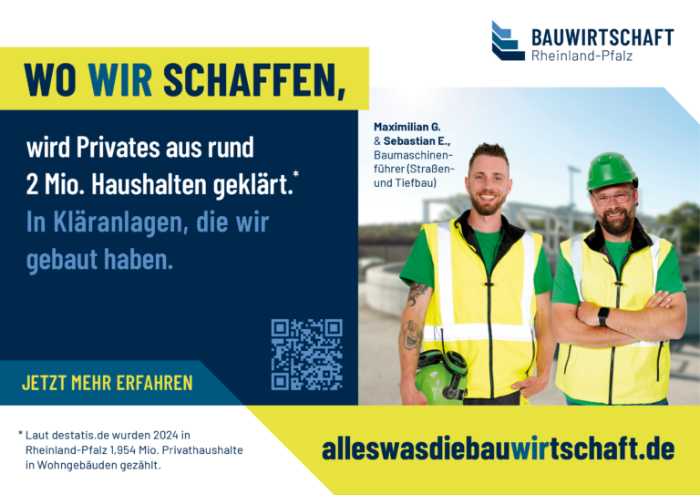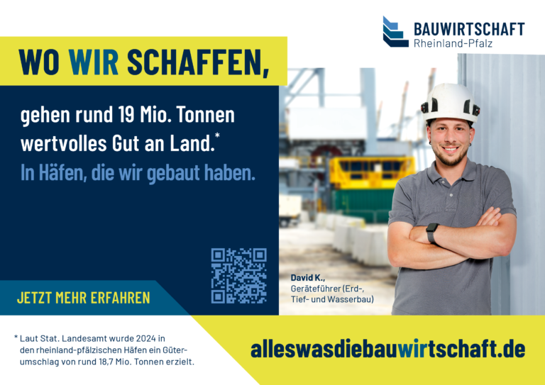 Eine Veränderung oder Weitergabe an Dritte ist nicht gestattet. // Werbliche oder kommerzielle Nutzungen außerhalb der offiziellen Kampagne (z. B. für eigene Produkte oder Dienstleistungen) sind nicht erlaubt. // Die Nutzung erfolgt auf eigene Verantwortung; eine Haftung der Bauwirtschaft Rheinland-Pfalz e. V. für Schäden, die durch die Verwendung entstehen, ist ausgeschlossen. // Es dürfen keine Motive oder Elemente aus den Datenpaketen in einen irreführenden oder diskriminierenden Zusammenhang gestellt werden.